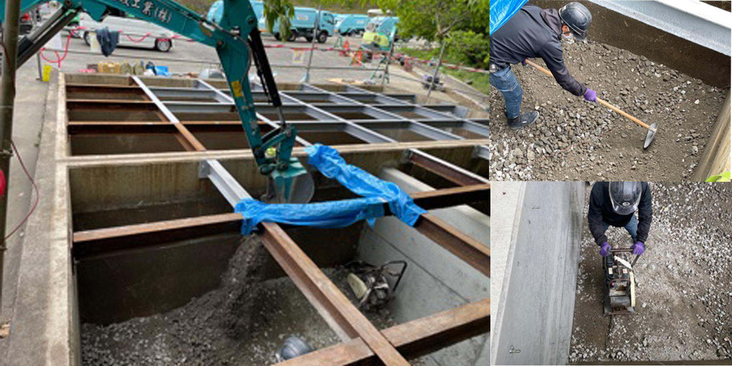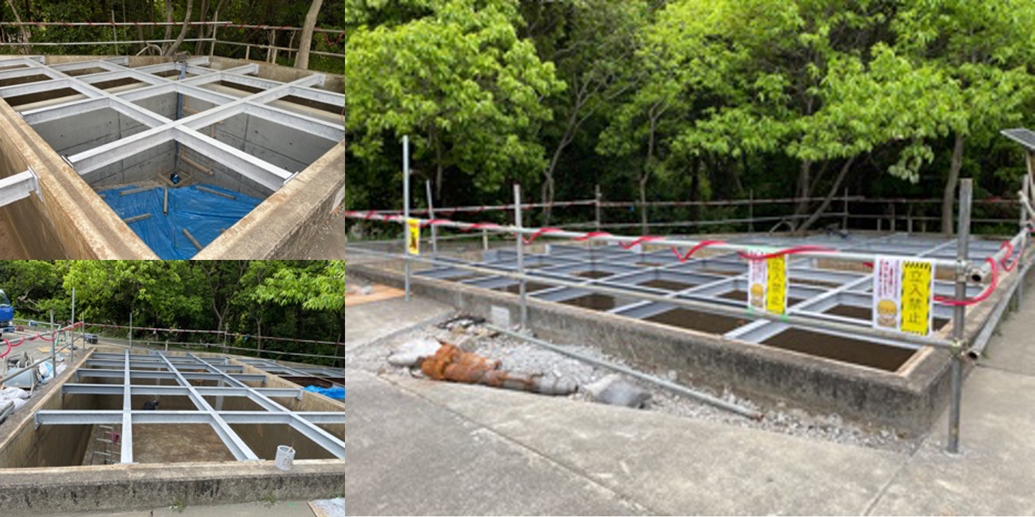 RC構造の雨水槽内から雨水を引き抜き槽の清掃を実施。 槽内を沈殿槽・曝気槽・調整槽と区切る構造変更を行う。